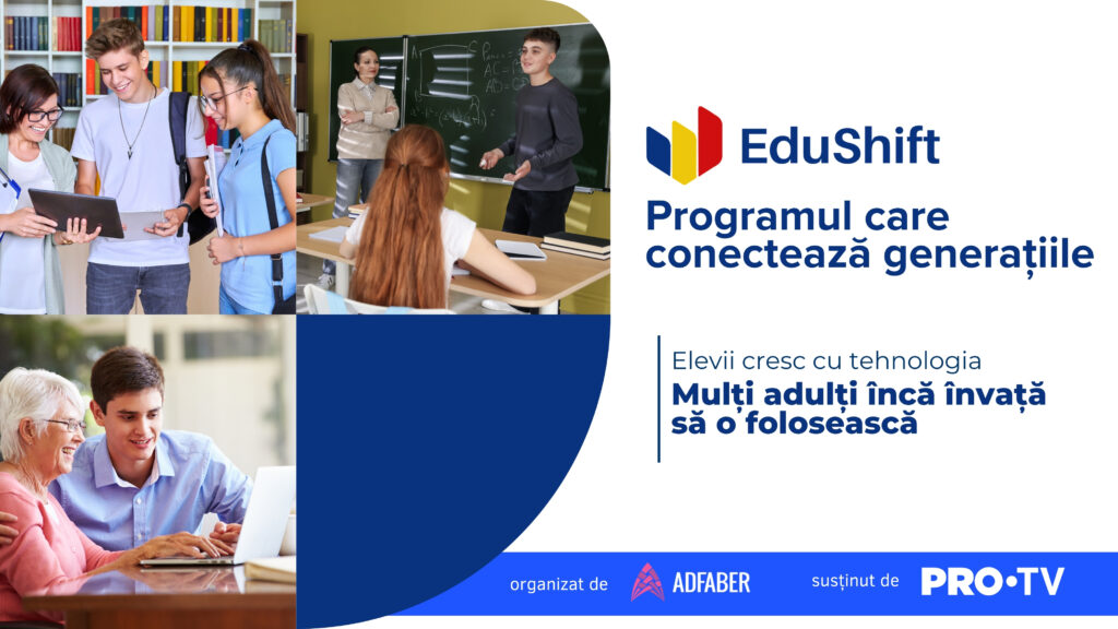 EduShift România, un program național de educație digitală dezvoltat de Asociația ADFABER, cu sprijinul PRO TV, își propune să transforme această realitate într-o oportunitate de învățare, dialog și colaborare între generații. Programul aduce în România un concept educațional aplicat la scară largă în alte țări – reverse mentoring – adaptat însă contextului românesc și realităților din școli și familii.